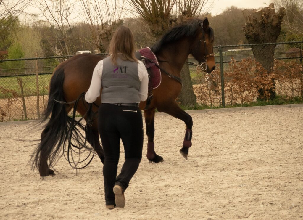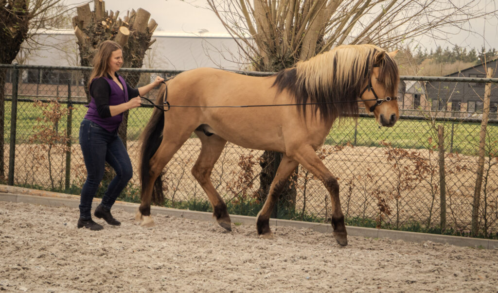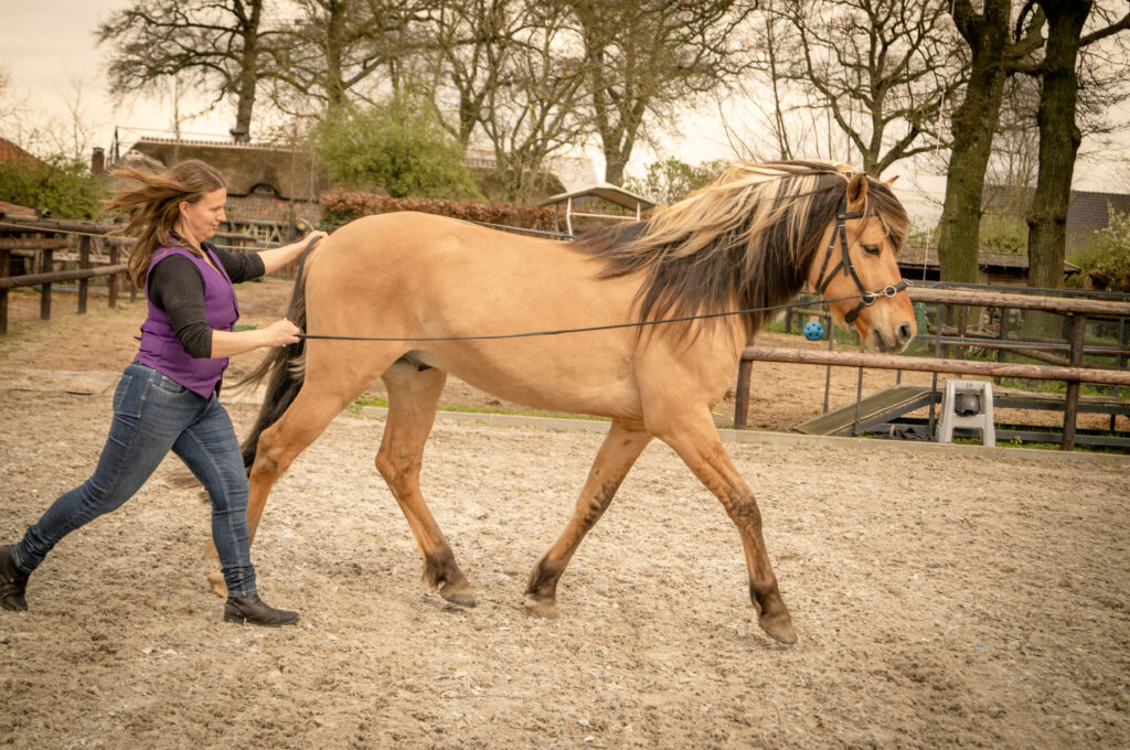 Hiermee begin je in een kleinere rijbak of longeercirkel. Voor jouzelf is dit aangenamer om het paard met jouw energie aan te sturen. Zou het paard bij jou blijven, dan kan dit uiteindelijk ook in een grote rijbak.